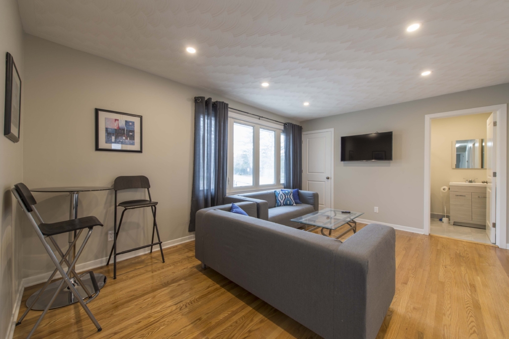 • Common spaces include large kitchen with quartz counters, breakfast bar and bar stools, fully furnished living room with wall mounted TV and separate bar table with 2 chairs.