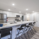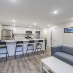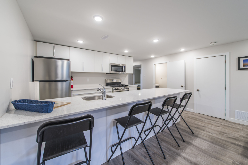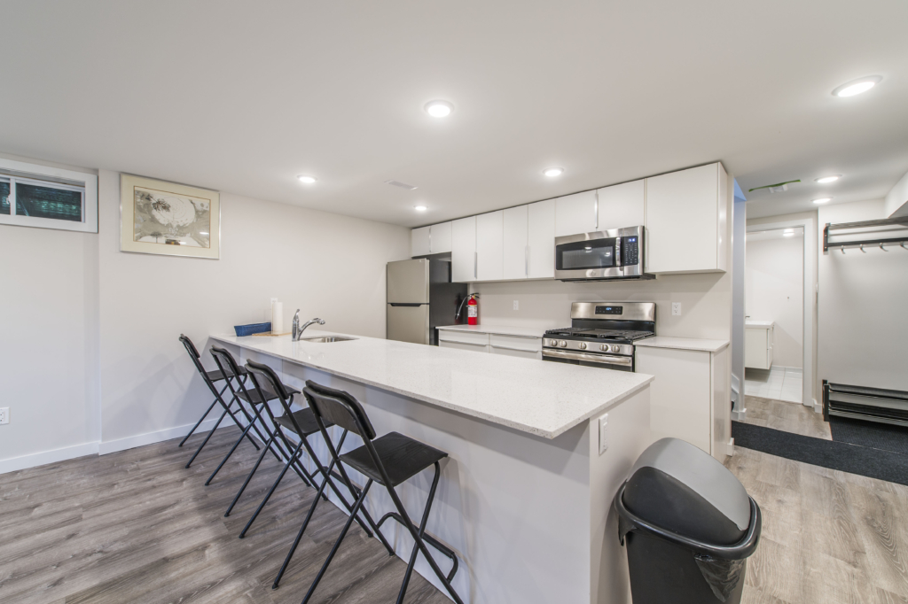 - Common spaces include large kitchen with quartz counter bar and 4 stools, and fully furnished living room with wall mounted TV.